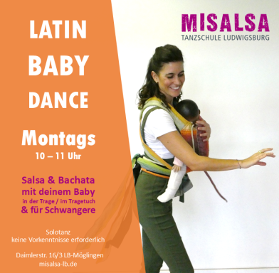 Wir lernen Schritte und Choreos auf Salsa, Bachata, Merengue und dein Baby ist in der Trage mit dabei.